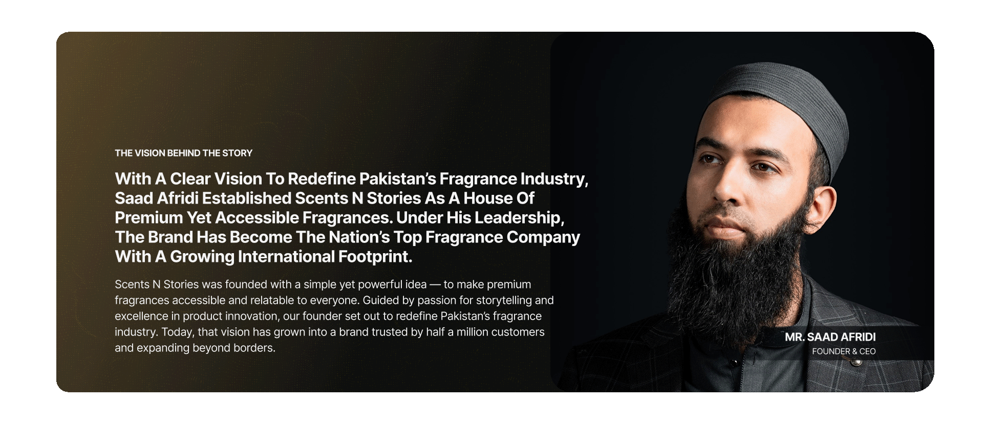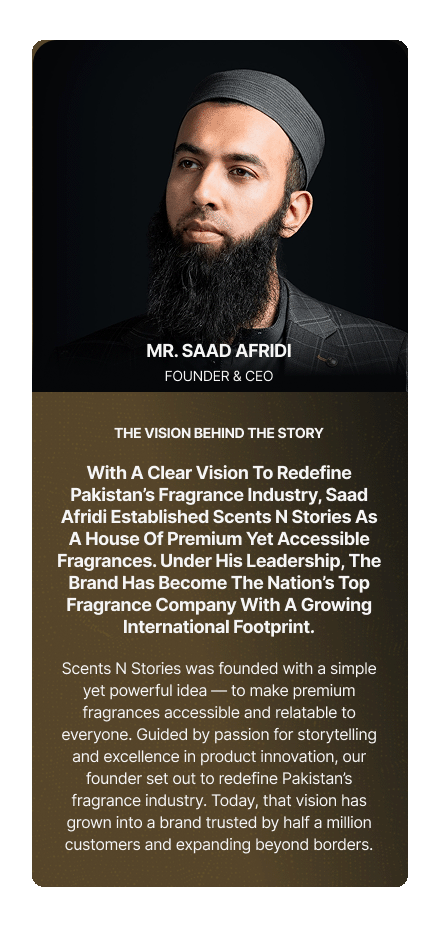 Founded with a vision to make premium fragrances accessible, Scents N Stories has grown into Pakistan’s most loved fragrance brand — trusted by over half a million customers nationwide. From a small startup to a household name with a retail presence across major cities, our journey has been guided by innovation, integrity, and an unshakable passion for storytelling through scent. Today, we stand as a proud pioneer from Pakistan, redefining fragrance retail and inspiring change with every bottle we create.